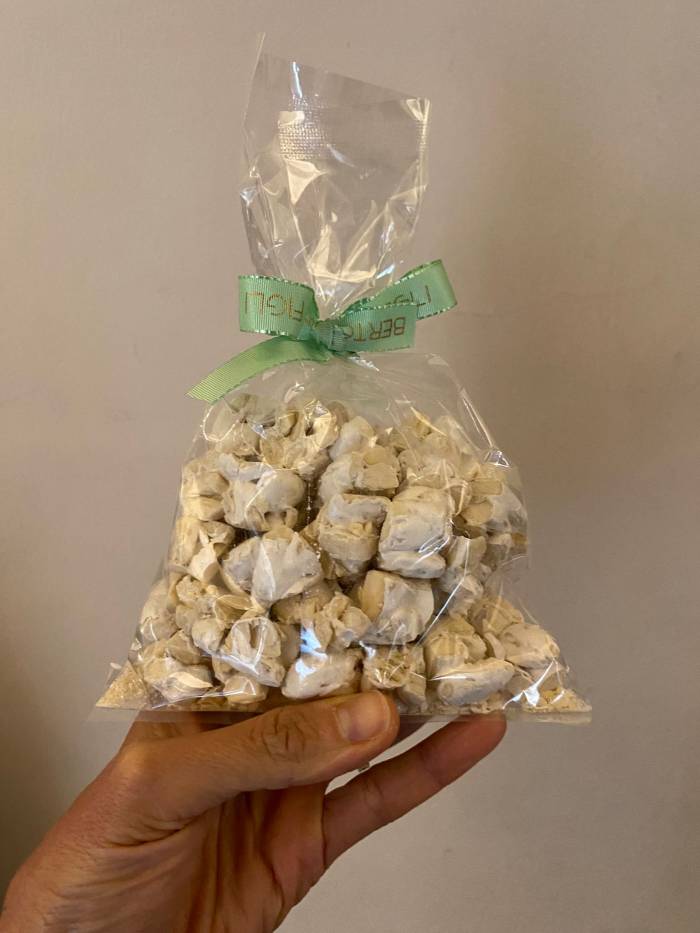 Alla fine degli anni ’70 il padre di famiglia Giovanni Fausto Bertolini decide di buttarsi nel mondo della pasticceria seguendo corsi a San Giovanni in Lupatoto, per poi aprire il proprio laboratorio a Cologna Veneta e divenire col tempo uno tra i più grandi interpreti del Mandorlato di tale cittadina. Questa antica preparazione risale alla prima metà dell’Ottocento e viene realizzata con materie prime di alta qualità: albume fresco, mandorle calibrate scelte a mano, miele d’acacia e zucchero bianco raffinato. Giovanni e la sua famiglia realizzano il mandorlato in diversi formati: a stecche, sotto forma di torte rotonde e rettangolari, a pezzetti sia semplici che ricoperti di cioccolato. Imperdibile.