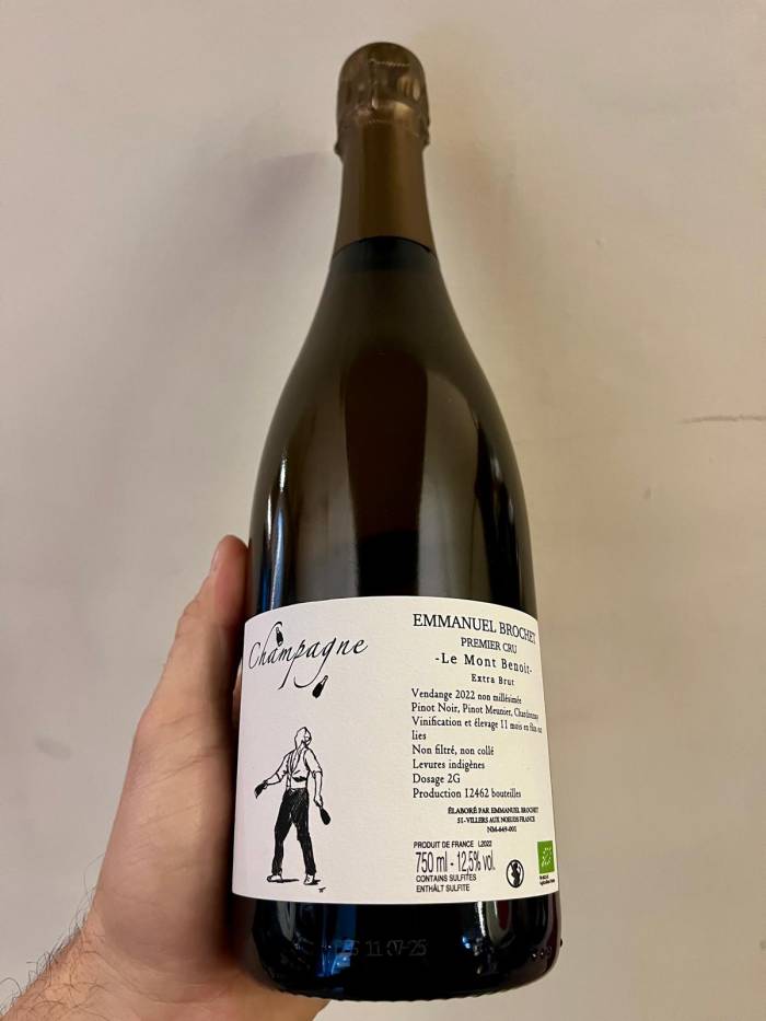 Nel piccolo villagio di Villers-aux-Noeuds, nella Montagne de Reims, si trova la cantina di Emmanuel Brochet, un vigneron che produce circa 11.000 bottiglie l’anno da due ettari e mezzo, nelle tre varietà classiche coltivate, Pinot Noir, Meunier e Chardonnay. Qui l'approccio alla vitivinicoltura naturale non è semplice esercizio di stile, ma rivela una determinata applicazione. L'innovazione non manca, soprattutto in fase di vinificazione, ma si percepisce chiaramente un fortissimo legame con la tradizione: ecco allora un piccolo torchio “coquard” (quello in legno, a base quadrata) posizionato nel garage di casa e il “parco tonneaux” nella sala adiacente al soggiorno-studio. Tutte le sue cuvée nascono e maturano nel legno per oltre un anno, ma il timbro boisé non è mai troppo evidente e si lega a doppio filo a una verve acido-citrica di incredibile equilibrio.
